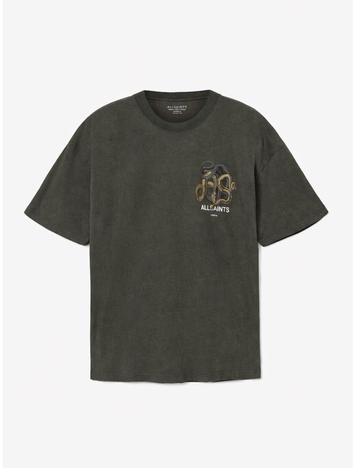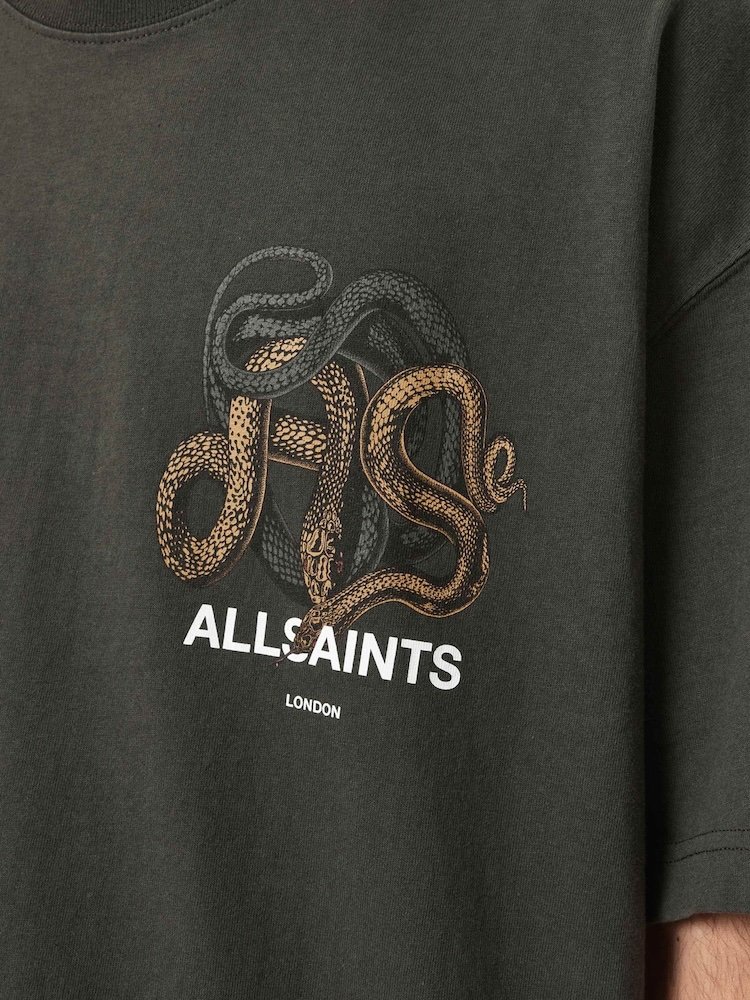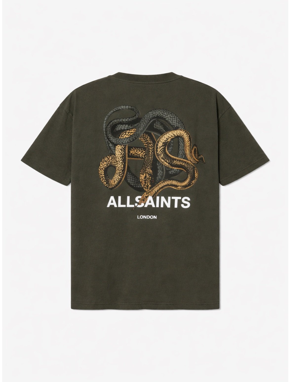 AllSaints Reticulate Oversized Graphic Snake Print T-Shirt – Duffel Green Camiseta de algodón orgánico 100% con ajuste oversized, cuello redondo y mangas cortas. Presenta un estampado extragrande de serpiente con el logotipo de AllSaints en la espalda. Color verde oliva (Duffel Green), ideal para un estilo urbano y moderno.