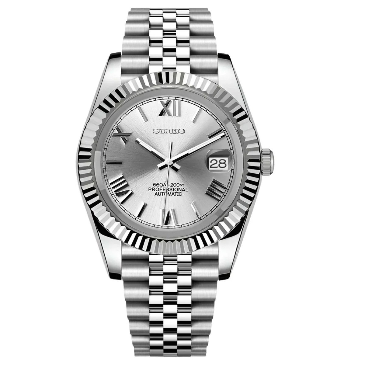 Inspirado en el icónico diseño Datejust y equipado con el confiable movimiento automático Seiko NH35, este reloj está ensamblado a mano para lograr precisión y estilo.